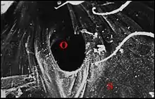 Vu au microscope électronique à balayage (M.E.B.), il se présente comme un orifice régulier situé sur le sternum au contact de son bord antérieur et de l’extrémité du labium, donc de la suture labio-sternale, Il est régulier, ovalaire et bordé d’une petite margelle postérieure chez Wendilgarda mustelina arnouxi (Fig.1,2), à peu près circulaire et de niveau avec la surface du tégument chez Theridiosoma sp, de Martinique (Fig.3), ouvert obliquement en bas, en avant et un peu en dedans, et mesurant de 10 à 20 µm de diamètre.