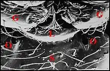 Dans celui, plus complexe de Wendilgarda (Schéma 1), la paroi de la poche s’infléchit brusquement dans les projections très saillantes qui avaient l’aspect de “tigettes” en microscopie photonique mais que nous pouvons qualifier ici “apophyses”, un peu incurvées, effectivement ("pointes") à leur extrémité libre et présentant une section transversale oblongue. Comme le reste de la paroi, ces apophyses, effectivement bi- ou tri-furquées en digitations à leur extrémité libre (Schéma 1-3), sont formées par de l’épicuticule et une exocuticule plus mince qu’ailleurs, assez riche en canaux poraires renfermant des languettes cytoplasmiques. Leur axe est occupé par des cellules épidermiques, par la cellule distale du canalicule conducteur (Schéma1-1)et la terminaison de ce dernier, ouvert en entonnoir sur le tiers inférieur de l’apophyse, au niveau de sa concavité (Schéma 1-3).