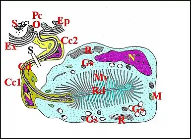 L’étude ultrastructurale chez Naatlo et Wendilgarda (Lopez, 1988, 1993[4],[5]) montre que les cellules et les canaux sont bien réunis en unités glandulaires fonctionnelles toutes semblables (Schémas 1 et 2) dont la sécrétion est reçue par la poche collectrice. Cette dernière et l’ensemble de tous les canaux qui y aboutissent, récepteurs inclus, constituent un appareil cuticulaire global. Chez les deux espèces étudiées, l'unité glandulaire comporte une cellule sécrétante ou adénocyte et la partie de l'appareil cuticulaire qui le dessert, soit un canalicule récepteur, un canalicule excréteur ou conducteur et des cellules canaliculaires (Schémas 1 et 2).