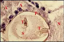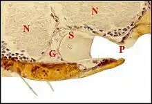 sternal, allongé (L = 90 à 100µm), plus large dans sa moitié postérieure (l = 60 à 70 µm) que dans l’antérieure (l = 40 µm), donc ovoïde ou piriforme (Fig.5,6) et orienté de telle sorte que son grand axe est à peu près horizontal, légèrement oblique en avant et un peu en dedans. Sa paroi est formée par une assise épidermique fine, bien visible seulement lorsqu’elle contient un pigment noir et surtout, par de la cuticule. Cette dernière, très mince au niveau du fond ou globalement chez Naatlo (2 µm), s’épaissit progressivement dans la partie antérieure (Wendilgarda) où elle atteint 4 µm et se raccorde à la chitine sterno-labiale (10 µm) sur le pourtour du pore (Fig.). Ainsi se