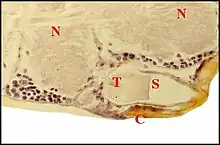Sa paroi est bien formée par un revêtement chitineux et par une assise épidermique interrompue dans la zone où aboutissent les canalicules.Le revêtement chitineux montre une couche intérieure d’épicuticule (épicuticule externe et interne) en continuité avec la paroi des canaux au niveau de leurs pores excréteurs individuels (Schéma 2), et une couche extérieure d’épicuticule, plus épaisse, montrant des canaux-poraires (pores-canaux), stratifiée en unités laminaires, s’interrompant brusquement au niveau des mêmes orifices. Elles sont toutes deux en continuité avec celles du tégument ventral sur le pourtour du pore labio-sternal. L’endocuticule tégumentaire qui est d’ailleurs absente de toute la poche, s’y termine en un “coin effilé”.