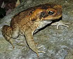 Les glandes parotoïdes sont bien visibles juste au-dessus de l'oreille, chez ce crapaud buffle (Bufo marinus), une espèce dont les invasions biologiques semblent avoir été facilitées par sa toxicité (à l'état d'adulte et de têtard)