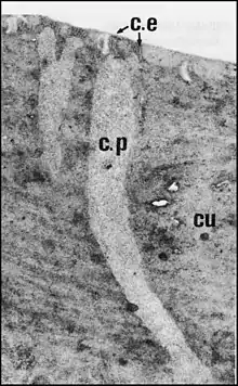 De plus, ces mêmes éléments, recouverts par la cuticule comme des cellules “ hypodermiques” banales, peuvent être rattachés aux glandes tégumentaires arthropodiennes de classe 1 telles que Noirot et Quennedey (1974)[5] les ont définies chez les Insectes (Schéma)