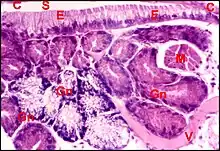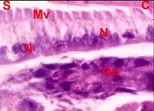 Les cellules sont pourvues de noyaux oblongs tous situés au même niveau et montrent un cytoplasme plus ou moins granuleux, vacuolaire (Fig.2), avec parfois des inclusions jaunâtres, et dont l’aspect évoque une activité glandulaire, sans permettre toutefois de l’affirmer. Les pôles apicaux sont pourvus d'une "brosse", faisceaux de microvilli vraisemblables.