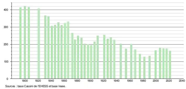 L'évolution du nombre d'habitants est connue à travers les recensements de la population effectués dans la commune depuis 1793. Pour les communes de moins de 10 000 habitants, une enquête de recensement portant sur toute la population est réalisée tous les cinq ans, les populations légales des années intermédiaires étant quant à elles estimées par interpolation ou extrapolation[27]. Pour la commune, le premier recensement exhaustif entrant dans le cadre du nouveau dispositif a été réalisé en 2006[28].