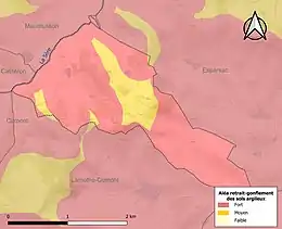Le retrait-gonflement des sols argileux est susceptible d'engendrer des dommages importants aux bâtiments en cas d’alternance de périodes de sécheresse et de pluie. La totalité de la commune est en aléa moyen ou fort (92 % au niveau départemental et 48,5 % au niveau national). Sur les 28 bâtiments dénombrés sur la commune en 2019, 28 sont en aléa moyen ou fort, soit 100 %, à comparer aux 96 % au niveau départemental et 54 % au niveau national. Une cartographie de l'exposition du territoire national au retrait gonflement des sols argileux est disponible sur le site du BRGM[24],[Carte 3].