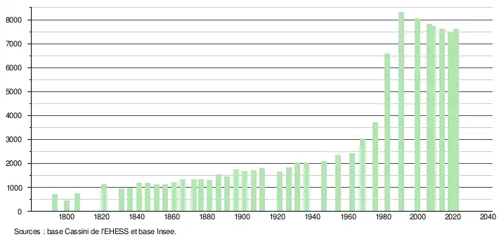 L'évolution du nombre d'habitants est connue à travers les recensements de la population effectués dans la commune depuis 1793. Pour les communes de moins de 10 000 habitants, une enquête de recensement portant sur toute la population est réalisée tous les cinq ans, les populations légales des années intermédiaires étant quant à elles estimées par interpolation ou extrapolation[21]. Pour la commune, le premier recensement exhaustif entrant dans le cadre du nouveau dispositif a été réalisé en 2008[22].