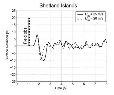 - les modèles numériques du tsunami pour les Shetland suggèrent que la hauteur des vagues auraient pu atteint une côte maximale de l'ordre de +13 m au-dessus du niveau marin de l'époque (- 20 m environ par rapport à aujourd'hui) le jour où le tsunami a eu lieu[2], mais ils semblent sous-estimer la réalité ;