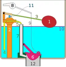 - Robinet flotteur - Robinet dans une chasse d'eau gravitaire. Anciennement, robinet dont la clef est sur le côté, et à laquelle est ajoutée une longue tringle terminée par un globe de cuivre, laquelle tige baisse ou lève selon que l'eau augmente ou diminue dans le réservoir, et qui conséquemment ouvre ou ferme la clef selon l'élévation de l'eau[F 19]. Voir aussi Flotteur.