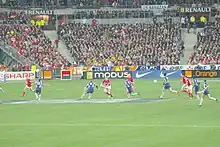 - Côté ouvert (ou grand côté) : après un point de fixation (mêlée, regroupement etc), désigne le côté le plus large par rapport aux lignes de touche.