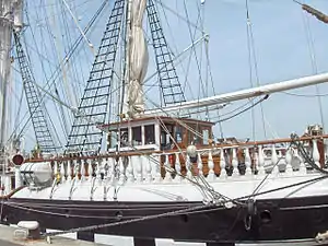 Un aile de dérive sur le Frise De Dicke Door. - Aile de dérive : type de quille pivotante disposée latéralement sur un voilier, par paire, utilisées comme dérive pour stabiliser et réduire la dérive latérale, principalement sur certains bateaux fluviaux à fond plat, ou mixte fluviaux et marin.