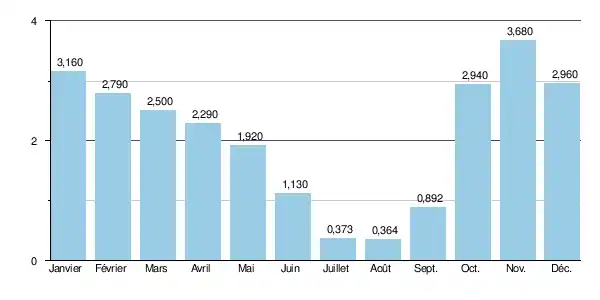 Aux étiages, le VCN3 peut chuter jusque 0,043 m3/s (43 litres/s), en cas de période quinquennale sèche, ce qui doit être qualifié d'étiage très sévère, le cours d'eau perdant alors plus de 98 % de son débit moyen[2].