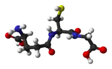 Le glutathion est un pseudo-tripeptide formé par la condensation d'acide glutamique, de cystéine et de glycine : γ-L-Glutamyl-L-cystéinylglycine. Le glutathion, qui existe sous forme oxydée et réduite, intervient dans le maintien du potentiel redox du cytoplasme de la cellule. Il intervient aussi dans un certain nombre de réactions de détoxication et d'élimination d'espèces réactives de l'oxygène. À noter que le groupement amine de la cystéine se condense avec la fonction acide carboxylique en γ de l'acide glutamique. Pratiquement toutes les cellules en contiennent une concentration élevée. On le représente de manière simplifiée par GSH (forme réduite) ou GSSG (forme oxydée), la fonction thiol lui conférant ses principales propriétés biochimiques.