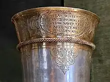 Dans le corpus de l'orfèvrerie séculière en Alsace, parmi les objets conservés ou répertoriés des XVIe et XVIIe siècles, les gobelets et les coupes sont les plus nombreux. Le gobelet se présente habituellement sous une forme tronconique, plus ou moins évasée vers le haut. Sa surface peut être sobre, mate, entre deux bandeaux brillants. Parfois finement rainuré, cet amati[10] évoque une peau de serpent (Schlangenhaut) (ou de requin, de raie). La surface peut aussi être richement décorée de gravures ou de motifs repoussés.