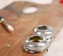 Le godet à palette est un récipient, simple ou double, que l'artiste peintre remplit d'huile siccative, d'essence de térébenthine ou de médium à peindre et qu'il clippe sur sa palette en bois pour faciliter les mélanges avec ses couleurs.