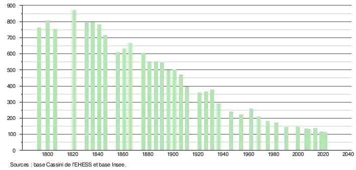 L'évolution du nombre d'habitants est connue à travers les recensements de la population effectués dans la commune depuis 1793. Pour les communes de moins de 10 000 habitants, une enquête de recensement portant sur toute la population est réalisée tous les cinq ans, les populations légales des années intermédiaires étant quant à elles estimées par interpolation ou extrapolation[21]. Pour la commune, le premier recensement exhaustif entrant dans le cadre du nouveau dispositif a été réalisé en 2008[22].