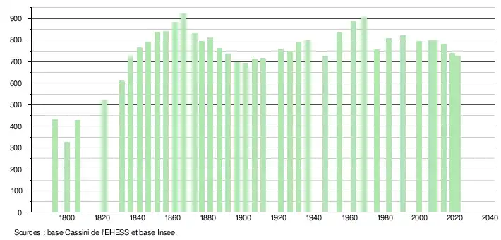 L'évolution du nombre d'habitants est connue à travers les recensements de la population effectués dans la commune depuis 1793. Pour les communes de moins de 10 000 habitants, une enquête de recensement portant sur toute la population est réalisée tous les cinq ans, les populations légales des années intermédiaires étant quant à elles estimées par interpolation ou extrapolation[28]. Pour la commune, le premier recensement exhaustif entrant dans le cadre du nouveau dispositif a été réalisé en 2008[29].