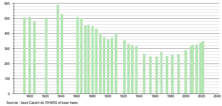 L'évolution du nombre d'habitants est connue à travers les recensements de la population effectués dans la commune depuis 1793. Pour les communes de moins de 10 000 habitants, une enquête de recensement portant sur toute la population est réalisée tous les cinq ans, les populations légales des années intermédiaires étant quant à elles estimées par interpolation ou extrapolation[19]. Pour la commune, le premier recensement exhaustif entrant dans le cadre du nouveau dispositif a été réalisé en 2008[20].