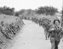 Prévu pour débarquer à 11 h sur Jig, la 56e brigade est déviée vers King en raison des défenses allemandes toujours actives au Hamel. La brigade débute alors son avance vers Bayeux[49]. Le 151e brigade arrive dans le même temps et après avoir rencontré une vive résistance, elle prend le contrôle de la route et voie ferrée entre Bayeux et Caen[50]. La 56e brigade avance lentement, et doit passer la nuit à moins de 2 km de Bayeux, son objectif[51]. La 69e brigade sécurise le flanc est et à la tombée de la nuit, établit le contact avec les forces canadiennes de Juno[51]