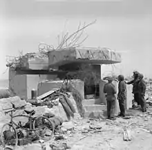 Les blindés spécialisés arrivent avec la première vague, dont les AVREs, les chars fléaux et les bulldozers blindés[44]. Dégager les sorties de plage se fait difficilement, certains chars étant embourbés ou endommagés par les mines. Un char fléau solitaire arrive finalement à ouvrir un passage vers la batterie du Mont-Fleury et Ver-sur-Mer[45]. Le passage est utilisé par les Green Howards et les chars du 4th/7th Dragoon Guards qui nettoient les poches de résistance à la batterie du Mont-Fleury. La compagnie B se déplace pour attaquer les positions allemandes sur la crête de Meuvaines tandis que la compagnie C se dirige vers l'ouest de Ver-sur-Mer pour couvrir l'attaque de Crépon, qui ouvre les routes vers Bayeux et Caen. Le 7th Green Howards attaque la batterie d'artillerie de Ver-sur-Mer et fait 50 prisonniers[46]. Le sergent-major Stanley Hollis (en) gagne la Victoria Cross lors de ces événements du . En chemin vers le Mont-Fleury, Hollis se retrouve pris pour cible par des mitrailleuses allemandes alors qu'il inspecte un blockhaus. Il tire sur l'entrée avec son Sten gun et dégoupille une grenade à travers le toit, tuant les défenseurs. Il nettoie ensuite une tranchée ennemie avant que les occupants d'un second blockhaus ne se rendent[47]. Plus tard dans la journée, il sauvera la vie de 3 de ses hommes durant la tentative de détruire un emplacement d'artillerie de campagne près d'une ferme à Crépon[48].