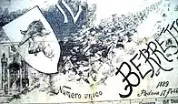 - Détail d'une gravure figurant l'arrivée du tonneau envoyé par les étudiants de Turin aux Fêtes de Bologne de 1888.