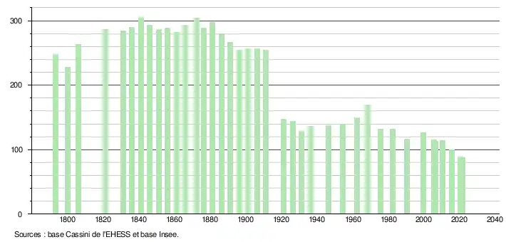 L'évolution du nombre d'habitants est connue à travers les recensements de la population effectués dans la commune depuis 1793. Pour les communes de moins de 10 000 habitants, une enquête de recensement portant sur toute la population est réalisée tous les cinq ans, les populations légales des années intermédiaires étant quant à elles estimées par interpolation ou extrapolation[36]. Pour la commune, le premier recensement exhaustif entrant dans le cadre du nouveau dispositif a été réalisé en 2005[37].
