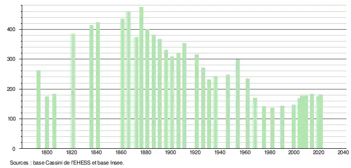 L'évolution du nombre d'habitants est connue à travers les recensements de la population effectués dans la commune depuis 1793. Pour les communes de moins de 10 000 habitants, une enquête de recensement portant sur toute la population est réalisée tous les cinq ans, les populations légales des années intermédiaires étant quant à elles estimées par interpolation ou extrapolation[16]. Pour la commune, le premier recensement exhaustif entrant dans le cadre du nouveau dispositif a été réalisé en 2004[17].