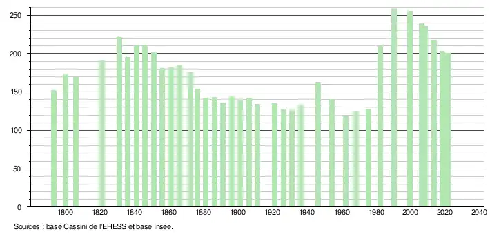 L'évolution du nombre d'habitants est connue à travers les recensements de la population effectués dans la commune depuis 1793. Pour les communes de moins de 10 000 habitants, une enquête de recensement portant sur toute la population est réalisée tous les cinq ans, les populations légales des années intermédiaires étant quant à elles estimées par interpolation ou extrapolation[21]. Pour la commune, le premier recensement exhaustif entrant dans le cadre du nouveau dispositif a été réalisé en 2008[22].