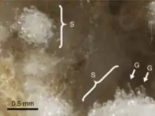 Photographie de gongylidia (G) et de staphylae (S) dans un jardin de champignon entretenu par des fourmis champignonnistes de l'espèce Acromyrmex echinatior.