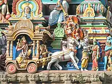Détail du sommet d'un gopura du temple de Minakshi montrant la prolifération de sculptures