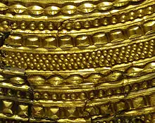 L'art avec lequel il a été exécuté est d'une qualité exceptionnelle : il a été fabriqué par martelage d'un seul lingot d'or, ce qui représente un temps passé et une dextérité considérables, et il est abondamment décoré de motifs d'anneaux concentriques en repoussé. Cette ornementation recouvre presque totalement la surface extérieure de cet objet, de sorte qu'il n'y a que très peu de surface plane. Il a été suggéré que ces entrelacs épousaient la forme de billes ou des plis d'un vêtement[2]