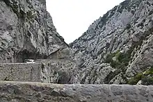 La route départementale D10 très étroite traverse les gorges de Galamus de part en part (D7 sur la commune de Saint-Paul de Fenouillet).