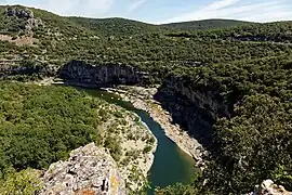 Les gorges de l'Ardèche sont des gorges pittoresques, haut lieu touristique du département français de l'Ardèche et frontalier de celui du Gard, dans leur cours inférieur. Elles forment un important canyon d'une trentaine de kilomètres, creusé par la rivière Ardèche dans le plateau calcaire, entre le pont d'Arc de Vallon-Pont-d'Arc et Saint-Martin-d'Ardèche, pouvant être descendues en canoë-kayak, ou par sentier de randonnée[1],[2], ou suivies du côté nord par la route touristique D 290, aménagée à travers la garrigue avec onze belvédères panoramiques. Elles sont classées réserve naturelle nationale depuis 1980, avec la réserve naturelle nationale des gorges de l'Ardèche[3],[4],[5].