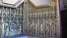 Conséquence d'une « spirale inflationnelle d'ostentation sociale[13] » qui anime les cours européennes, notamment en réaction à l'émergence d'une classe bourgeoise qui s'affirmera au XVe siècle, la très haute noblesse adopte une stylisation à l'extrême des mœurs et du comportement, qui se traduit par une quête effrénée de splendeur démonstrative. Les riches retables sculptés d'origine allemande exposant, ouverts, des statuettes de bois doré, et fermés, des peintures, apparaissent en France à la faveur de la commande par Philippe le Hardi au sculpteur d'origine flamande Jacques de Baerze, du retable, spectaculaire pour l'époque, de la chartreuse de Champmol, peint ensuite par Melchior Broederlam[14].