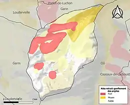 La commune est vulnérable au risque de mouvements de terrains constitué principalement du retrait-gonflement des sols argileux[28]. Cet aléa est susceptible d'engendrer des dommages importants aux bâtiments en cas d’alternance de périodes de sécheresse et de pluie. 31,1 % de la superficie communale est en aléa moyen ou fort (88,8 % au niveau départemental et 48,5 % au niveau national). Sur les 49 bâtiments dénombrés sur la commune en 2019, 48 sont en aléa moyen ou fort, soit 98 %, à comparer aux 98 % au niveau départemental et 54 % au niveau national. Une cartographie de l'exposition du territoire national au retrait gonflement des sols argileux est disponible sur le site du BRGM[29],[Carte 3].