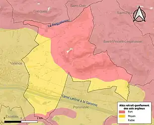 Le retrait-gonflement des sols argileux est susceptible d'engendrer des dommages importants aux bâtiments en cas d’alternance de périodes de sécheresse et de pluie. 99,9 % de la superficie communale est en aléa moyen ou fort (92 % au niveau départemental et 48,5 % au niveau national). Sur les 422 bâtiments dénombrés sur la commune en 2019, 422 sont en aléa moyen ou fort, soit 100 %, à comparer aux 96 % au niveau départemental et 54 % au niveau national. Une cartographie de l'exposition du territoire national au retrait gonflement des sols argileux est disponible sur le site du BRGM[26],[Carte 3].