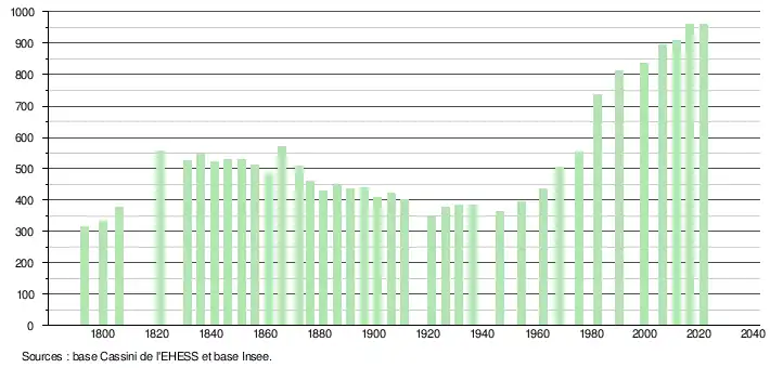 L'évolution du nombre d'habitants est connue à travers les recensements de la population effectués dans la commune depuis 1793. Pour les communes de moins de 10 000 habitants, une enquête de recensement portant sur toute la population est réalisée tous les cinq ans, les populations légales des années intermédiaires étant quant à elles estimées par interpolation ou extrapolation[33]. Pour la commune, le premier recensement exhaustif entrant dans le cadre du nouveau dispositif a été réalisé en 2006[34].