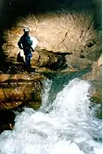 La rivière coule alors dans un canyon étroit et très corrodé. La progression y est difficile sur encore plus de 3 kilomètres, en chemin on trouve une grande salle dite de la « Clé de Voûte » (repère 24), des passages de type conduite forcée avec de l'eau profonde et le Chaos Kupieck (repère 25).