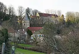 Vue sur le bourg-castral avec la mairie, l'église et le château. | |||||