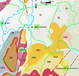 Le territoire communal repose sur le bassin houiller keupérien de Haute-Saône, riche en houille, gypse, pyrite et marne irisée (c'est dans cette strate qu'est exploité le sel gemme) qui affleurent dans la partie est du territoire (t5M, t5-6 et t6M)[2] mais aussi sur le gisement de schiste bitumineux de Haute-Saône daté du Toarcien[3].