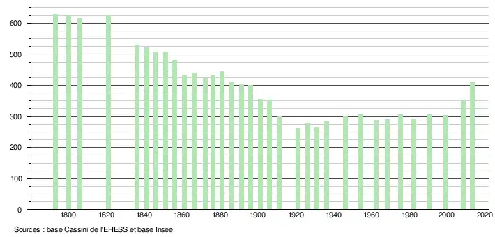 - Dans le tableau des recensements et le graphique, par convention dans Wikipédia, le principe a été retenu, pour les populations légales postérieures à 1999 de n’afficher dans le tableau des recensements et le graphique que les populations correspondant à l'année 2006, première population légale publiée calculée conformément aux concepts définis dans le décret no 2003-485 du 5 juin 2003, et les années correspondant à une enquête exhaustive de recensement pour les communes de moins de 10 000 habitants, ainsi que la dernière population légale publiée par l’Insee.