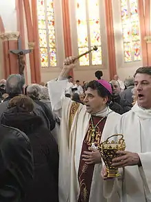 Le goupillon est un objet de la liturgique chrétienne utilisé pour asperger d'eau bénite objets ou personnes participant à une cérémonie religieuse. Il ressemble à un court bâton de bois ou de métal, garni à son extrémité de poils rudes ou d'une boule percée de trous.