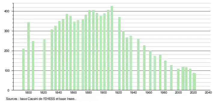 | L'évolution du nombre d'habitants est connue à travers les recensements de la population effectués dans la commune depuis 1793. Pour les communes de moins de 10 000 habitants, une enquête de recensement portant sur toute la population est réalisée tous les cinq ans, les populations légales des années intermédiaires étant quant à elles estimées par interpolation ou extrapolation[24]. Pour la commune, le premier recensement exhaustif entrant dans le cadre du nouveau dispositif a été réalisé en 2005[25]. En 2021, la commune comptait 85 habitants[Note 3], en diminution de 22,02 % par rapport à 2015 (Corrèze : −0,86 %, France hors Mayotte : +1,84 %). |