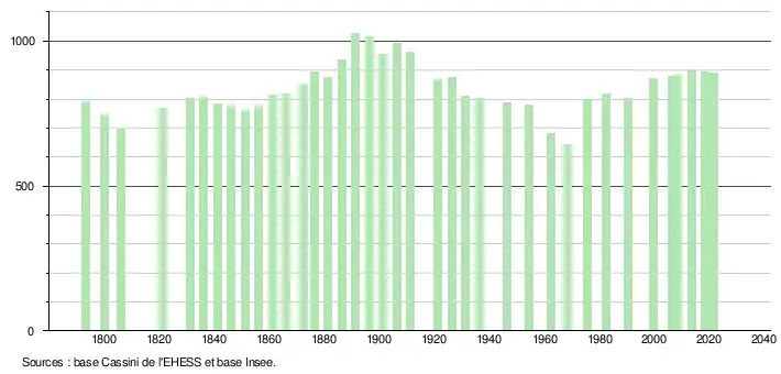 L'évolution du nombre d'habitants est connue à travers les recensements de la population effectués dans la commune depuis 1793. Pour les communes de moins de 10 000 habitants, une enquête de recensement portant sur toute la population est réalisée tous les cinq ans, les populations légales des années intermédiaires étant quant à elles estimées par interpolation ou extrapolation[19]. Pour la commune, le premier recensement exhaustif entrant dans le cadre du nouveau dispositif a été réalisé en 2008[20].