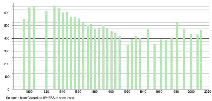 - Dans le tableau des recensements et le graphique, par convention dans Wikipédia, le principe a été retenu, pour les populations légales postérieures à 1999 de n’afficher dans le tableau des recensements et le graphique que les populations correspondant à l'année 2006, première population légale publiée calculée conformément aux concepts définis dans le décret no 2003-485 du 5 juin 2003, et les années correspondant à une enquête exhaustive de recensement pour les communes de moins de 10 000 habitants, ainsi que la dernière population légale publiée par l’Insee.
