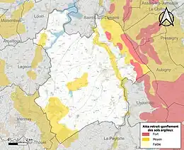 Les mouvements de terrains susceptibles de se produire sur la commune sont des tassements différentiels[18]. Le retrait-gonflement des sols argileux est susceptible d'engendrer des dommages importants aux bâtiments en cas d’alternance de périodes de sécheresse et de pluie[19]. 25,1 % de la superficie communale est en aléa moyen ou fort (54,9 % au niveau départemental et 48,5 % au niveau national)[Carte 2]. Depuis le , en application de la loi ELAN, différentes contraintes s'imposent aux vendeurs, maîtres d'ouvrages ou constructeurs de biens situés dans une zone classée en aléa moyen ou fort[Note 4],[20].