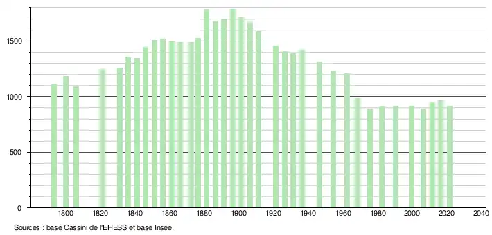 L'évolution du nombre d'habitants est connue à travers les recensements de la population effectués dans la commune depuis 1793. Pour les communes de moins de 10 000 habitants, une enquête de recensement portant sur toute la population est réalisée tous les cinq ans, les populations légales des années intermédiaires étant quant à elles estimées par interpolation ou extrapolation[24]. Pour la commune, le premier recensement exhaustif entrant dans le cadre du nouveau dispositif a été réalisé en 2006[25].