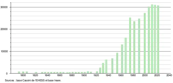 - Par convention dans Wikipédia, le principe a été retenu de n’afficher dans le tableau des recensements et le graphique, pour les populations légales postérieures à 1999, que les populations correspondant à une enquête exhaustive de recensement pour les communes de moins de 10 000 habitants, et que les populations des années 2006, 2011, 2016, etc. pour les communes de plus de 10 000 habitants, ainsi que la dernière population légale publiée par l’Insee pour l'ensemble des communes.