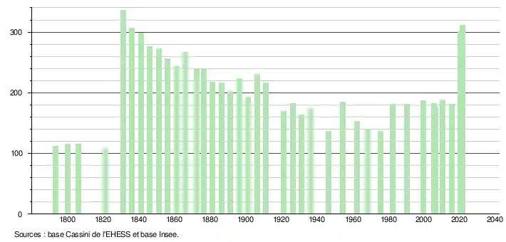 L'évolution du nombre d'habitants est connue à travers les recensements de la population effectués dans la commune depuis 1793. Pour les communes de moins de 10 000 habitants, une enquête de recensement portant sur toute la population est réalisée tous les cinq ans, les populations légales des années intermédiaires étant quant à elles estimées par interpolation ou extrapolation[25]. Pour la commune, le premier recensement exhaustif entrant dans le cadre du nouveau dispositif a été réalisé en 2005[26].