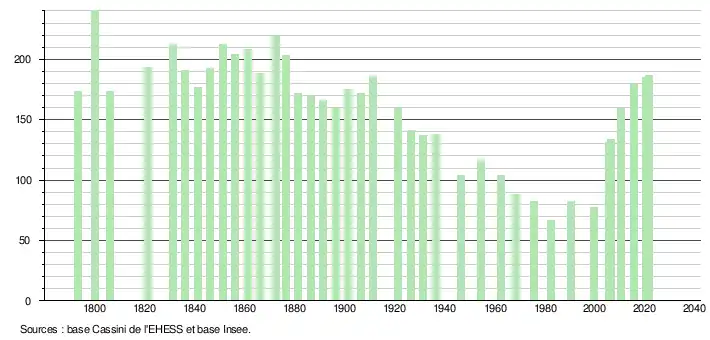 L'évolution du nombre d'habitants est connue à travers les recensements de la population effectués dans la commune depuis 1793. Pour les communes de moins de 10 000 habitants, une enquête de recensement portant sur toute la population est réalisée tous les cinq ans, les populations légales des années intermédiaires étant quant à elles estimées par interpolation ou extrapolation[29]. Pour la commune, le premier recensement exhaustif entrant dans le cadre du nouveau dispositif a été réalisé en 2005[30].